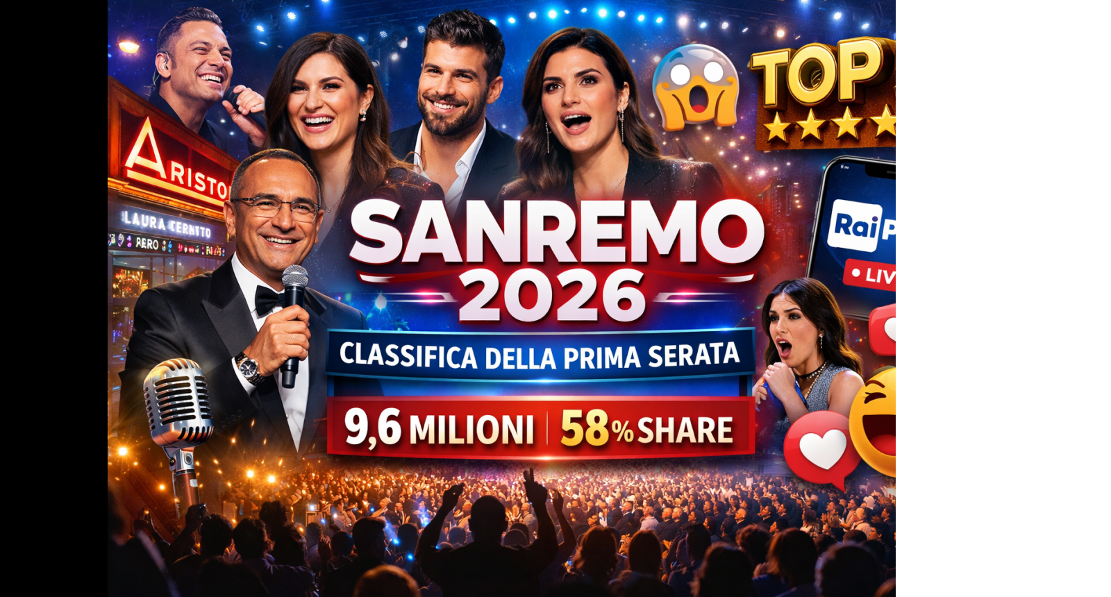 La prima serata del Festival ha registrato circa 9,6 milioni di spettatori con uno share del 58%. Il dato conferma la forza dell’evento nel panorama televisivo italiano. Rispetto all’edizione precedente si segnala un lieve calo, ma il Festival mantiene comunque una quota di pubblico superiore alla metà degli spettatori attivi in quella fascia.